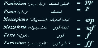 الف) نشانه هاي مربوط به شدت (ديناميك ) : از ميان تمام نشانه هاي نت نويسي، نشانه هاي مربوط به شدت (ديناميك) نسبت به ساير نشانه هاي نت نويسي از دقت كمتري برخوردار هستند. در اروپا طي قرن هجده، هنگامي كه آهنگسازان نقش غير فعالتري در اجراي آثار خود پيدا كردند، لازم بود نشانه هايي براي تعيين شدت صوت مورد نظر براي اجرا كننده بهكار برند. نشانه هاي مربوط به ديناميك به همين منظور گسترش يافت. اين نشانه ها نيز مانند اغلب اصطلاحات موسيقي به زبان ايتاليايي هستند. نشانه هاي زير در پايين حامل قرار ميگيرند.