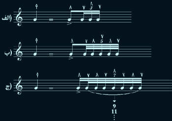 در سطر بالايي از نمونة ج در صفحة بعد، طرز نگارش ترمولو به شيوههاي مختلف، و در سطر پاييني طرز اجراي آن را ملاحظه ميكنيد