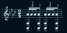 در قطعات ضربي با تمپوي سريع، مانند چهارمضرابها، چپْتريل بهصورت زير اجرا ميشود
